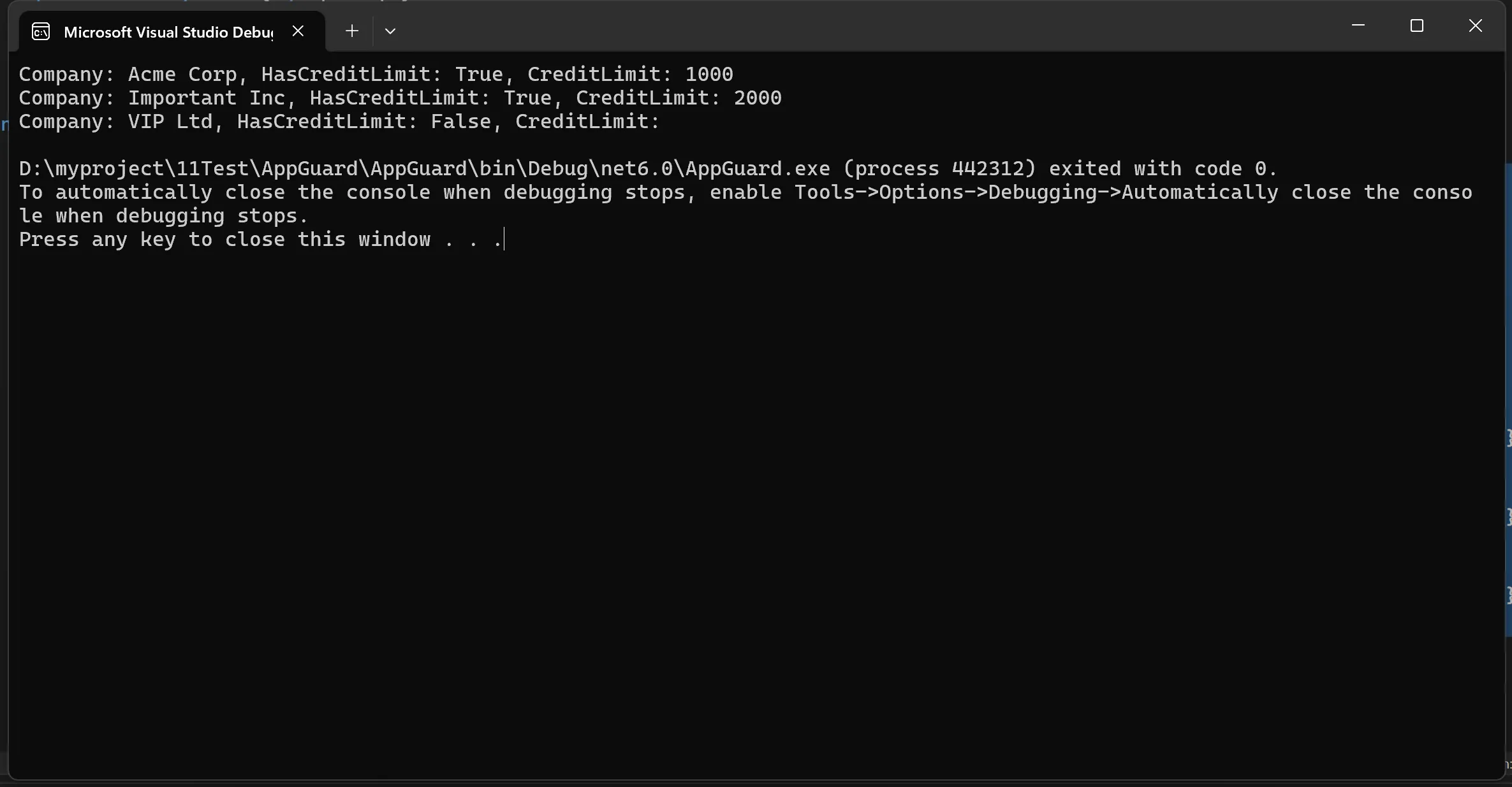 Console.WriteLine($"Company: {company2.Name}, HasCreditLimit: {result2.HasCreditLimit}, CreditLimit: {result2.CreditLimit}");